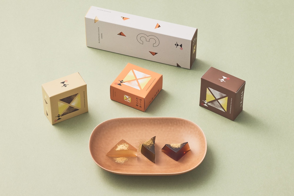 すっきりとした甘みが特徴の和三盆糖と三温糖をブレンドし、風味・色・食感にこだわった「和三盆わらび餅」、宇治のほうじ茶を香ばしく仕上げて練り込んだ「ほうじ茶わらび餅」、沖縄波照間産の黒糖を使用し深いコクのある甘さに仕上げた「黒糖わらび餅」の3種をセットにした詰合せ。三角の穴から個箱のカラーがのぞくオリジナルパッケージに入れてお届けします。