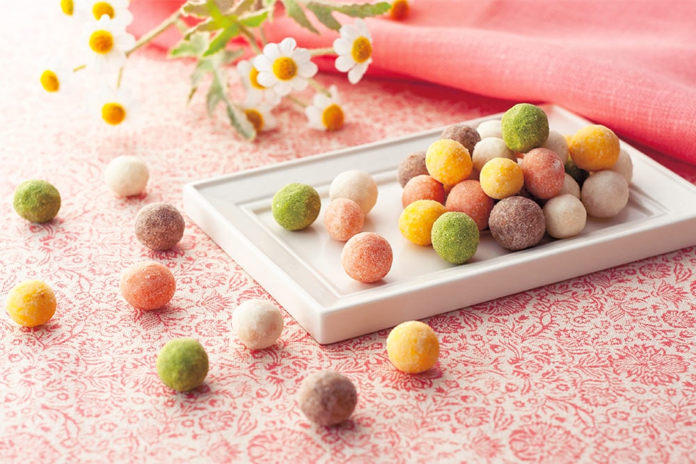 新しいスタイルに仕上げたモダンな五色豆です。柔らかく煎った落花生の生地に五色のクリームの衣を掛け、甘さ控えめ、ふんわりソフトに仕上げました。色も風味も色とりどりの楽しい五色をお楽しみください。柔らかいピーナッツに、あっさりした甘みのクリームパウダーをまぶし、可愛らしい五色に仕上げました。白はミルク・赤はイチゴ・黄はバナナ・茶はコーヒー・緑は抹茶と各色とも違った風味が楽しめるソフトな新五色豆です。