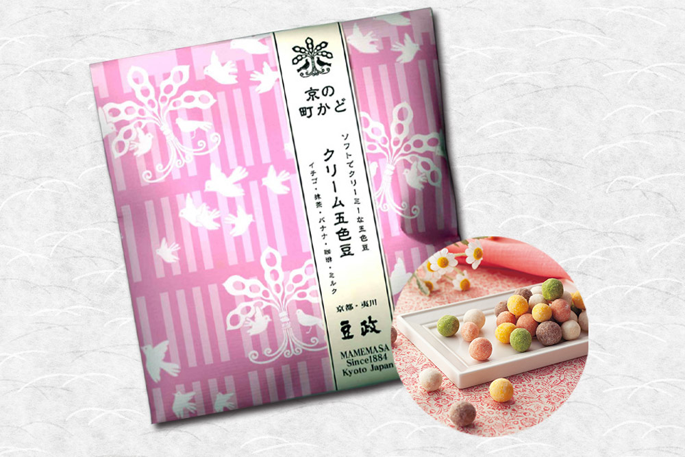 新しいスタイルに仕上げたモダンな五色豆です。柔らかく煎った落花生の生地に五色のクリームの衣を掛け、甘さ控えめ、ふんわりソフトに仕上げました。色も風味も色とりどりの楽しい五色をお楽しみください。柔らかいピーナッツに、あっさりした甘みのクリームパウダーをまぶし、可愛らしい五色に仕上げました。白はミルク・赤はイチゴ・黄はバナナ・茶はコーヒー・緑は抹茶と各色とも違った風味が楽しめるソフトな新五色豆です。