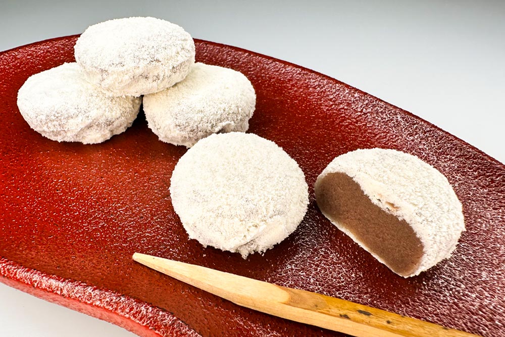 なめらかかつ濃厚なこし餡を、木べらで練り上げた求肥餅で包みこみ、鈴鹿山脈に降り積もる白雪に見立てて阿波特産の和三盆をまぶした白く美しい餅菓子です。